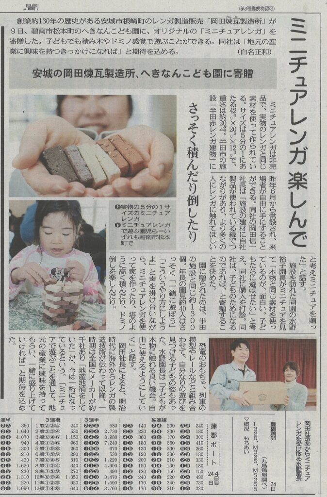 弊社の取り組みが中日新聞に掲載されました。安城市の岡田煉瓦製造所が、へきなんこども園様へオリジナルの「ミニチュアレンガ」を寄贈したことをご紹介いただきました。